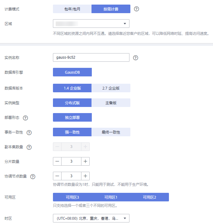 2. 在创建实例页面,选择计费模式,填写并选择实例相关信息后,单击“立即购买”。