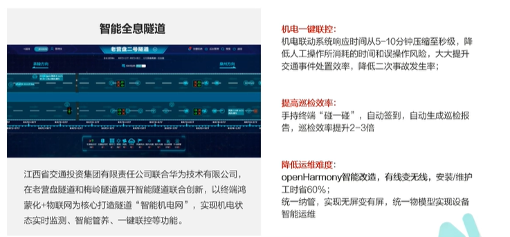 我们通过使用华为云IoT和OpenHarmony,实现了对智慧隧道的全方位智能化管控。通过创新的方式提升了隧道的感知能力、协同能力和综合管控能力,并形成了一套自主创新的智慧隧道标准规范体系。为了实现这一目标,我们从实际经验出发,介绍了如何基于华为云IoT和OpenHarmony智能管控隧道内的设备。我们通过使用行业终端鸿蒙化的理念和华为云IoT核心技术,实现了隧道近场设备的智能连接。我们基于华为云平台打造了一套标准的物模型,支持多种机电设备接入协议,帮助客户实现设备的统一纳管、状态实时监控、统一业务操作等功能。通过“碰一碰、搜一搜”的特性,结合近场通信技术,实现了远程管理和智能化交互巡检人员带来了工作便利性,并节省了巡检和运维时间和提高工作效率。