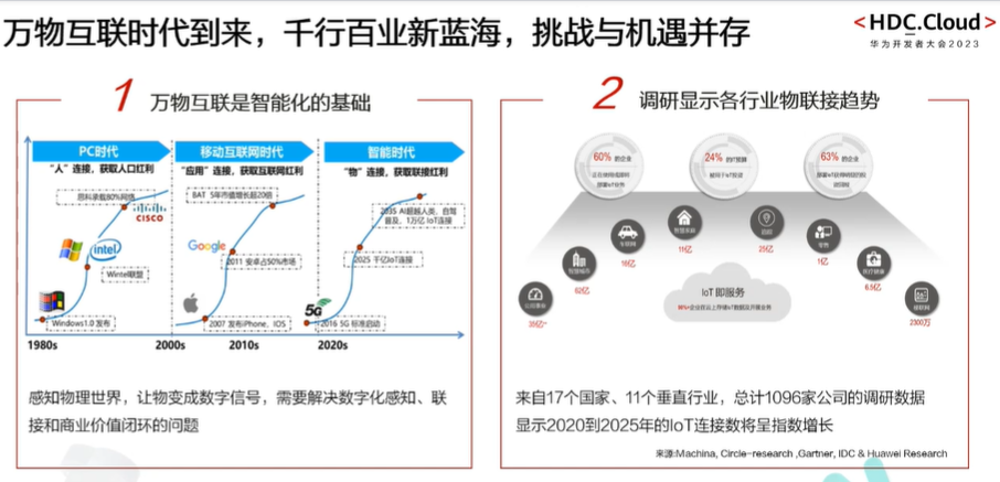 万物联的智能实践已经到来,在前40年,首先是以PC为中心的互联网时代实现了人与人的链接,然后再接着是以手机为中心的移动互联网时代实现了人与人24小时的连接,实现人与应用的连接,现在我们进入了万物互联的时代,希望把所有的千行百业的物都连接到数字世界,让所有的物都为人类服务
