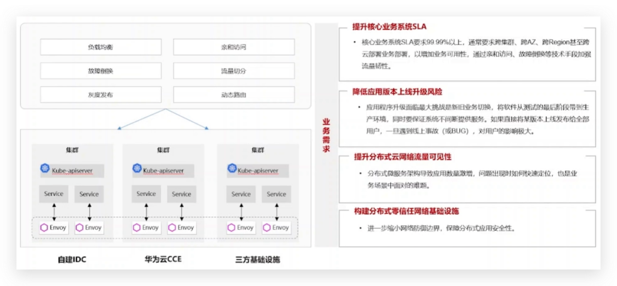 在分布式云原生架构下,保障应用的韧性至关重要。为提升核心业务系统的服务级别协议(SLA),需要跨区域、跨可用区、甚至跨云部署业务,以增加业务的可用性。通过亲和访问、故障倒换等技术手段,实现流量在不同节点之间的平衡和容错,确保系统的高可用性和可靠性,进而满足99.99%以上的SLA要求。