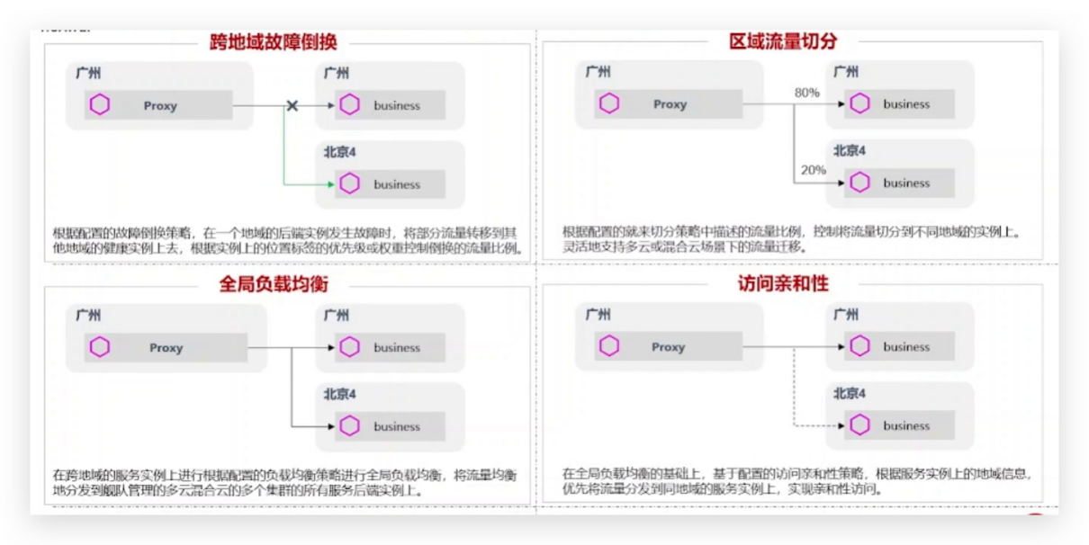 4. 亲和访问和故障倒换:UCS服务网格实现用户流量的亲和接入,将访问导向到与其亲和的后端服务。同时,当某个区域的实例发生故障时,根据设定的策略自动将一定比例或全部的流量切换到其他健康的实例上,保证业务的连续性和可靠性。