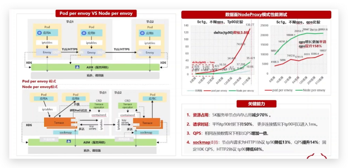 UCS服务网格的节点代理模式提供了一系列关键能力,显著提升了资源占用、请求时延、QPS和sockmap支持等方面的性能。首先,节点代理模式将5K服务单节点内存占用减少了70%,有效降低了资源消耗,提供更高的可扩展性和效率。