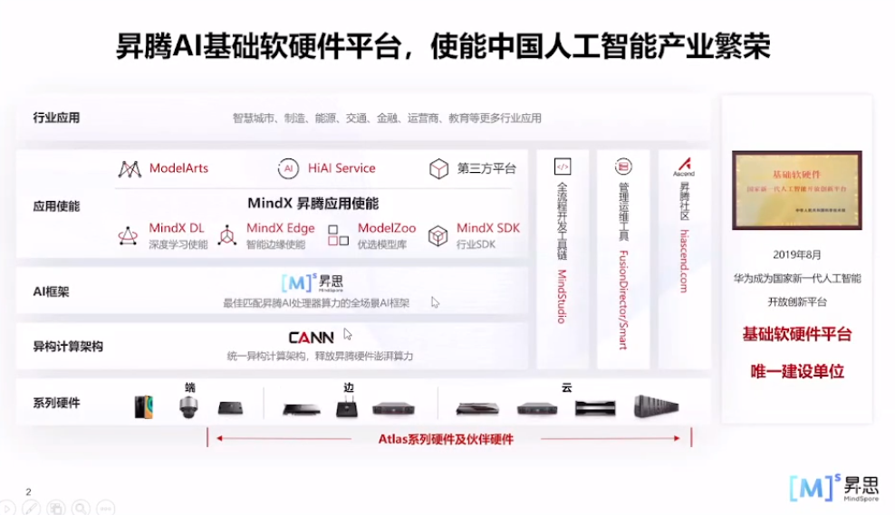 昇腾AI基础软硬件平台包含华为Atlas系列硬件及伙伴自有品牌硬件、异构计算架构CANN、全场景AI框架昇思MindSpore、昇腾应用使能MindX和一站式开发平台ModelArts等。异腾AI基础软硬件平台,使能中国人工智能产业繁荣。