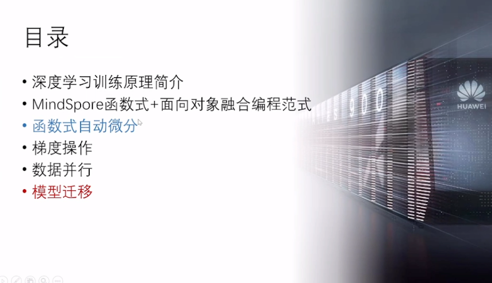 今天的主题主要有以下几个方面:深度学习训练原理简介,MindSpore函数式+面向对象融合编程范式,函数式自动微分,梯度操作,数据并行,模型迁移。