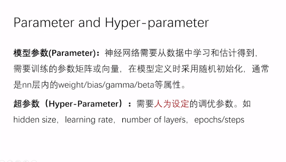 模型参数(Parameter):神经网络需要从数据中学习和估计得到需要训练的参数矩阵或向量,在模型定义时采用随机初始化,通常是nn层内的weight/bias/gamma/beta等属性。超参数(Hyper-Parameter):需要人为设定的调优参数。如hidden size, learning rate, number of layers,epochs/steps。
