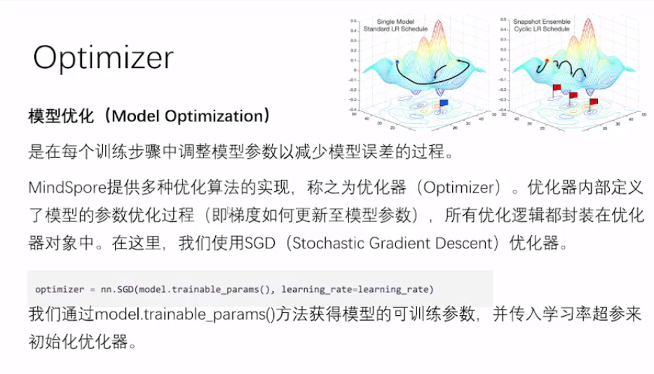MindSpore提供多种优化算法的实现,称之为优化器 (Optimizer) 。优化器内部定义了模型的参数优化过程(即梯度如何更新至模型参数),所有优化逻辑都封装在优化器对象中。在这里,我们使用SGD (Stochastic Gradient Descent) 优化器。