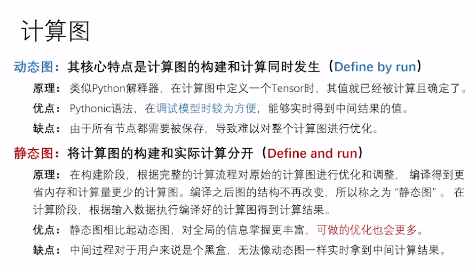 优点: Pythonic语法,在调试模型时较为方便,能够实时得到中间结果的值。缺点:由于所有节点都需要被保存,导致难以对整个计算图进行优化。