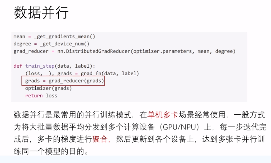 数据并行是最常用的并行训练模式,在单机多卡场景经常使用,一般方式为将大批量数据平均分发到多个计算设备 (GPU/NPU) 上,每一步迭代完成后,多卡的梯度进行聚合,然后更新到各个设备上,达到多张卡并行训练同一个模型的目的。