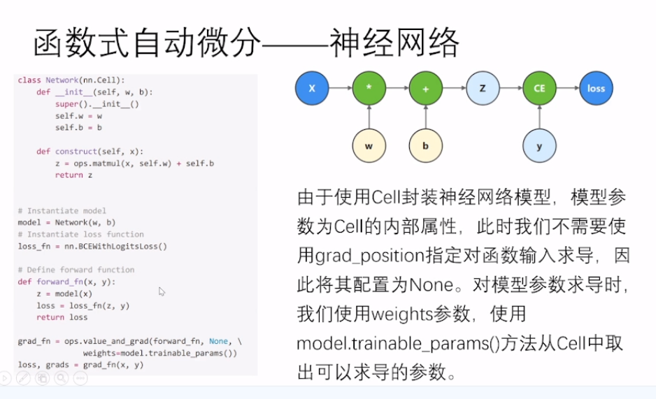由于使用Cell封装神经网络模型,模型参数为Cell的内部属性,此时我们不需要使用grad_position指定对函数输入求导,因此将其配置为None。对模型参数求导时我们使用weights参数,使用model.trainable_params()方法从Cell中取出可以求导的参数。