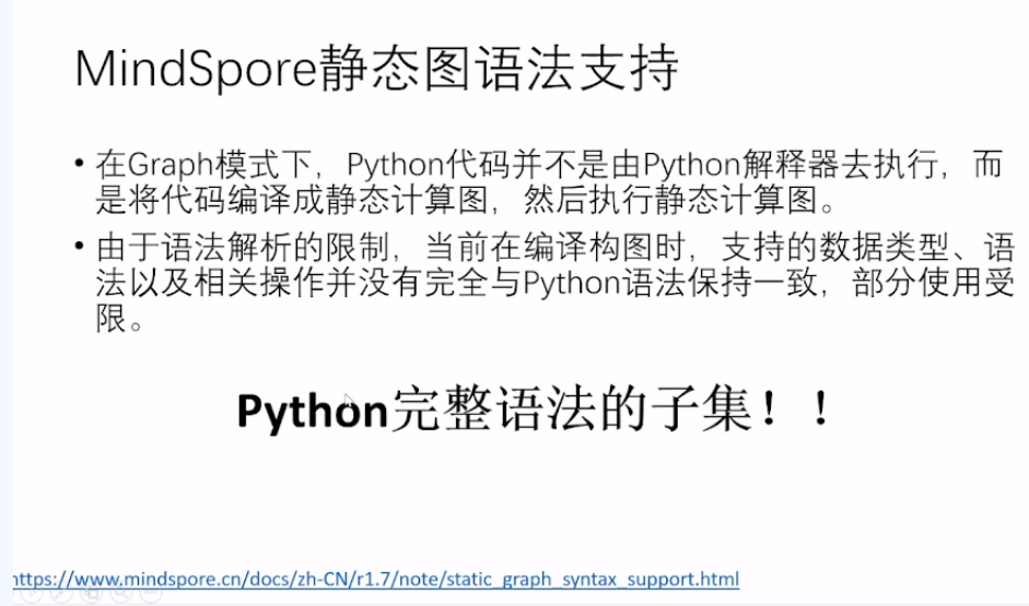 在Graph模式下,Python代码并不是由Pvthon解释器去执行,而是将代码编译成静态计算图,然后执行静态计算图。由于语法解析的限制,当前在编译构图时,支持的数据类型、语法以及相关操作并没有完全与Python语法保持一致,部分使用受限。