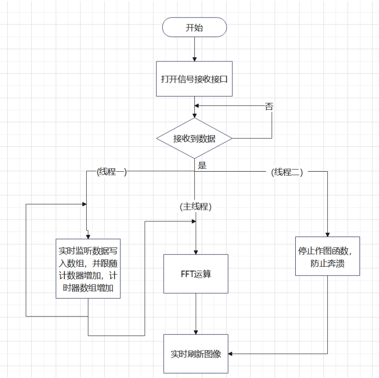 首先设计信号监听函数,若有数据输入,则接口正确;若无数据输入则继续监听直到传入数据。接收到数据后根据控件可打开线程,首先是线程一,实时监听数据并将数据存入数组,并附有一个时间轴数组与之对应。主线程为作图函数,首先对接受的数据进行FFT变换,之后对信号与频谱作图并实时刷新。线程二为控制绘图线程,点击控件后会改变绘制条件来结束绘制。逻辑图如下: