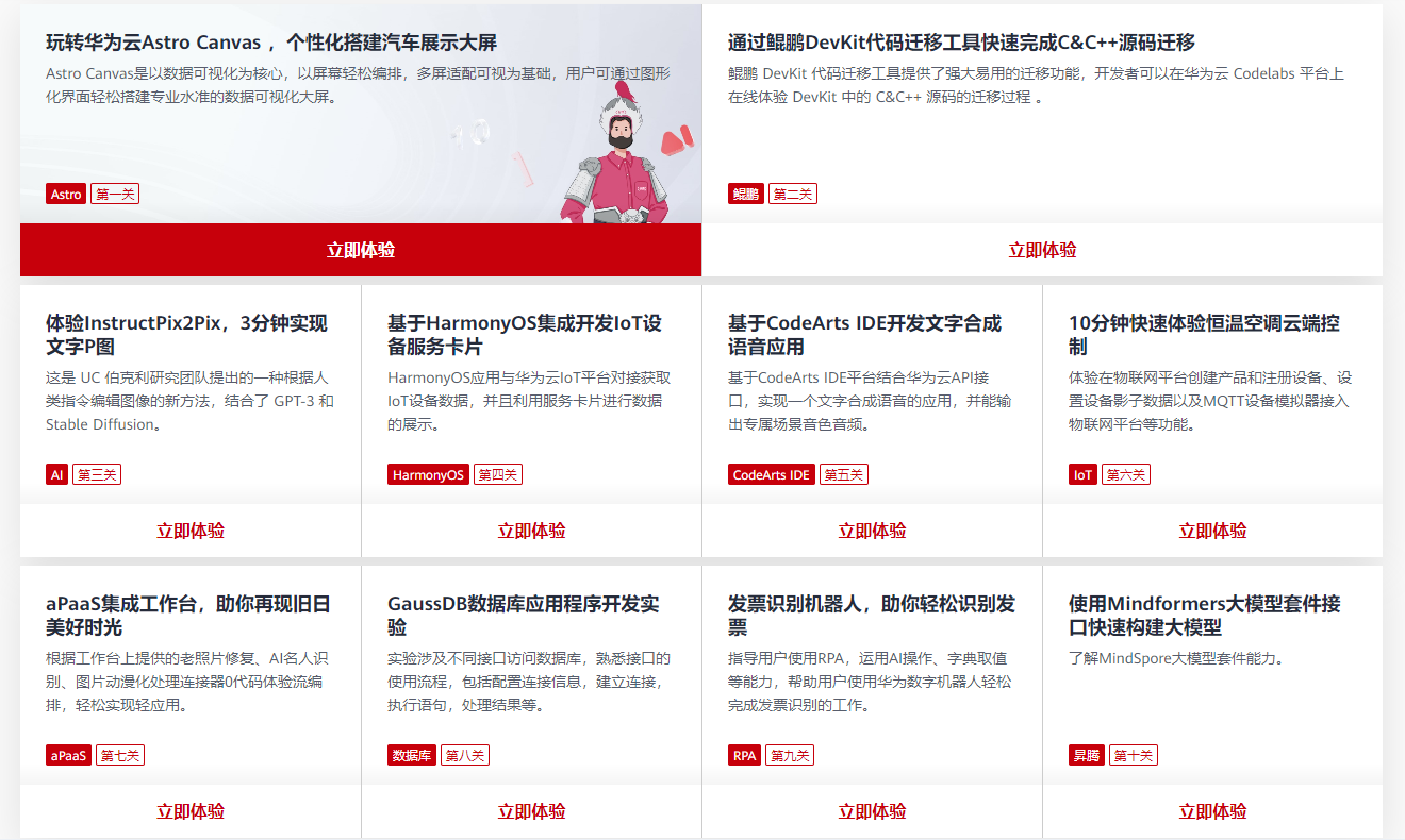 1024程序员节期间,华为云为广大开发者准备了10+趣味体验关卡,覆盖鲲鹏、昇腾、鸿蒙、数据库、AI、低代码等热门技术领域,完成任一关卡闯关体验,将有机会争夺“武状元”头衔,赢得终极大奖Swtich游戏机。