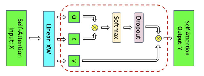 Self-attention中的softmax和dropout算子计算结果占用内存大,但计算量相对少,不保留正向计算结果到反向,在反向计算流程可以重新计算softmax和dropout的结果。