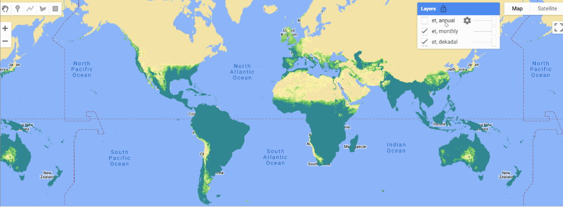 Map.addLayer(viirs_et_d_i.select('et'), {min: 0, max: 10, palette: et_palette}, 'et, dekadal')