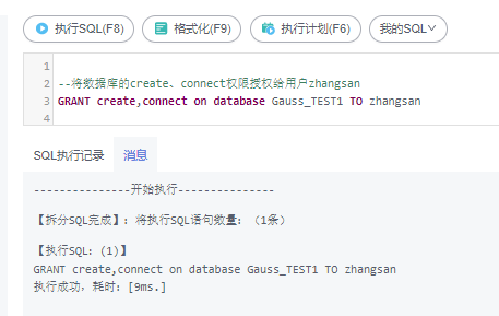 GRANT create,connect on database Gauss_TEST1 TO zhangsan