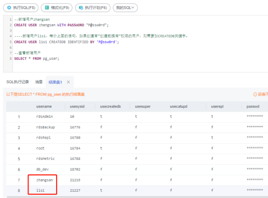 ----新增用户lisi,等价上面的语句,如果创建有“创建数据库”权限的用户,则需要加CREATEDB关键字。