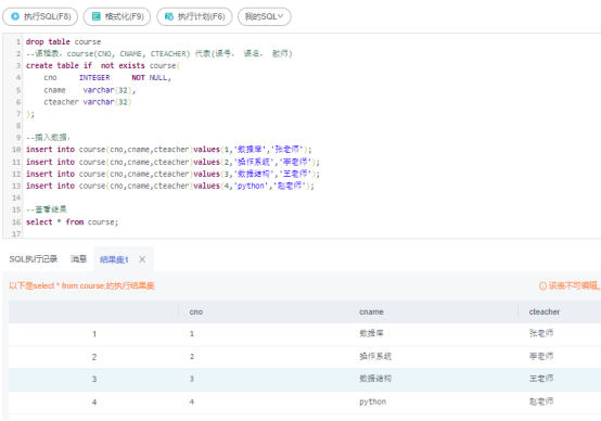 insert into course(cno,cname,cteacher)values(4,'python','赵老师');