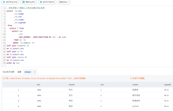 示例补充:上述SQL语句中用到子查询in 、窗口函数row_number()、用到左连接left join 。