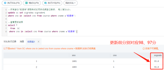 示例1:所有参加"数据库"课程考试的同学成绩登记错误, 现需要每人增加1分