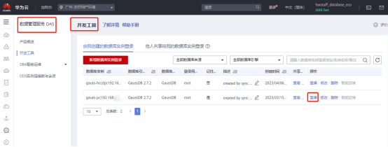 依次进入:“服务列表——数据管理服务 DAS——开发工具——登录对应的实例”,如下图: