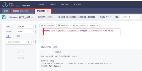 通过JAVA脚本访问GaussDB云数据库,并进行库表操作: