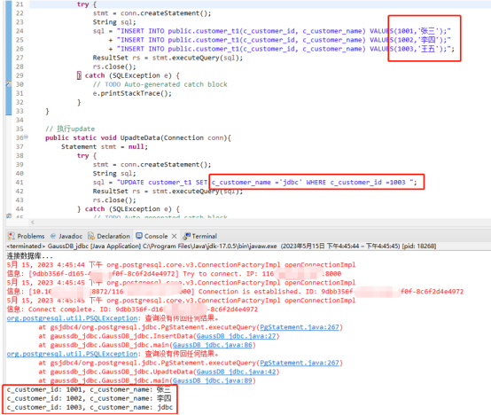 结论:以上结果均与GaussDB云数据端的数据完全匹配,测试结果正确,jdbc访问GaussDB顺利完成。