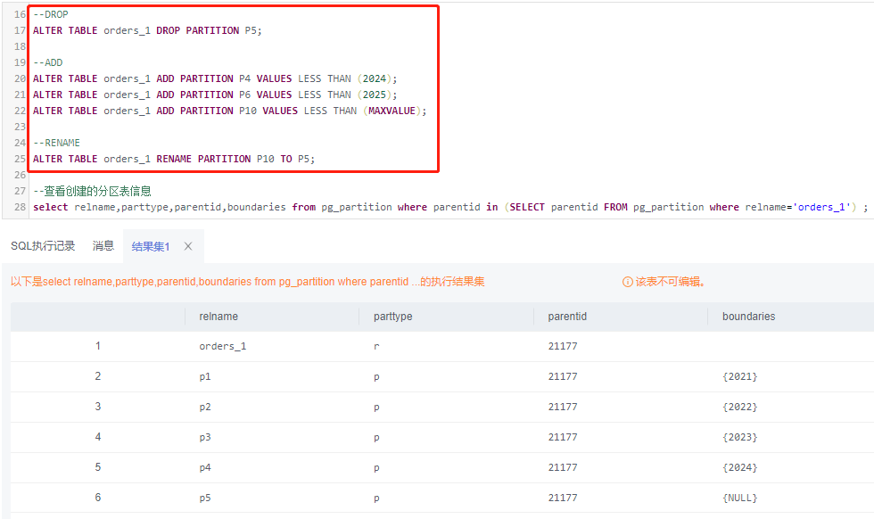 ALTER TABLE orders_1 ADD PARTITION P6 VALUES LESS THAN (2025);