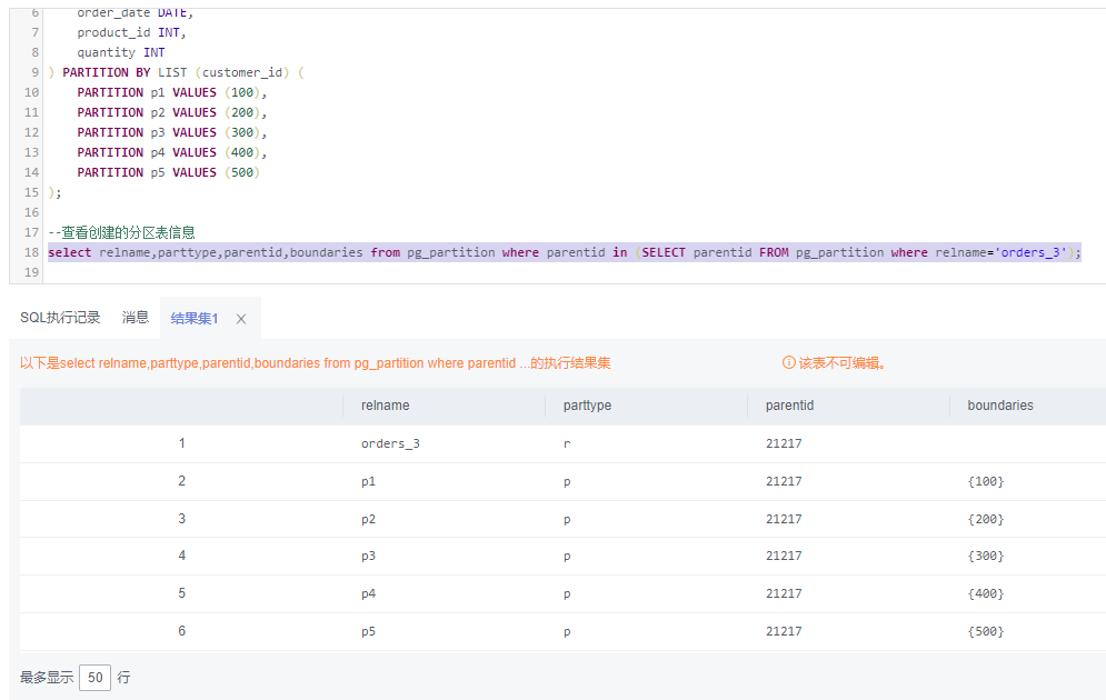 select relname,parttype,parentid,boundaries from pg_partition where parentid in (SELECT parentid FROM pg_partition where relname='orders_1') ;
