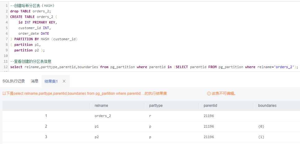 哈希分区表:将数据根据内部哈希算法依次映射到每一个分区中,包含的分区个数由创建分区表时指定。