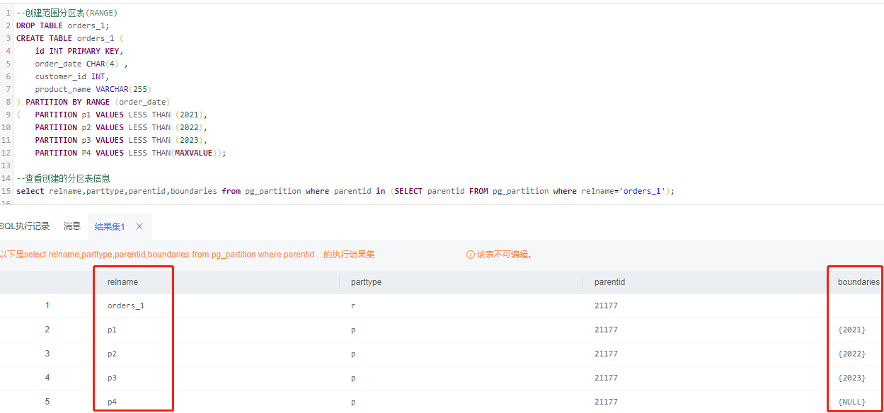 范围分区表:将数据基于范围映射到每一个分区,这个范围是由创建分区表时指定的分区键决定的。这种分区方式是最为常用的,并且分区键经常采用日期,例如将销售数据按照月份进行分区。
