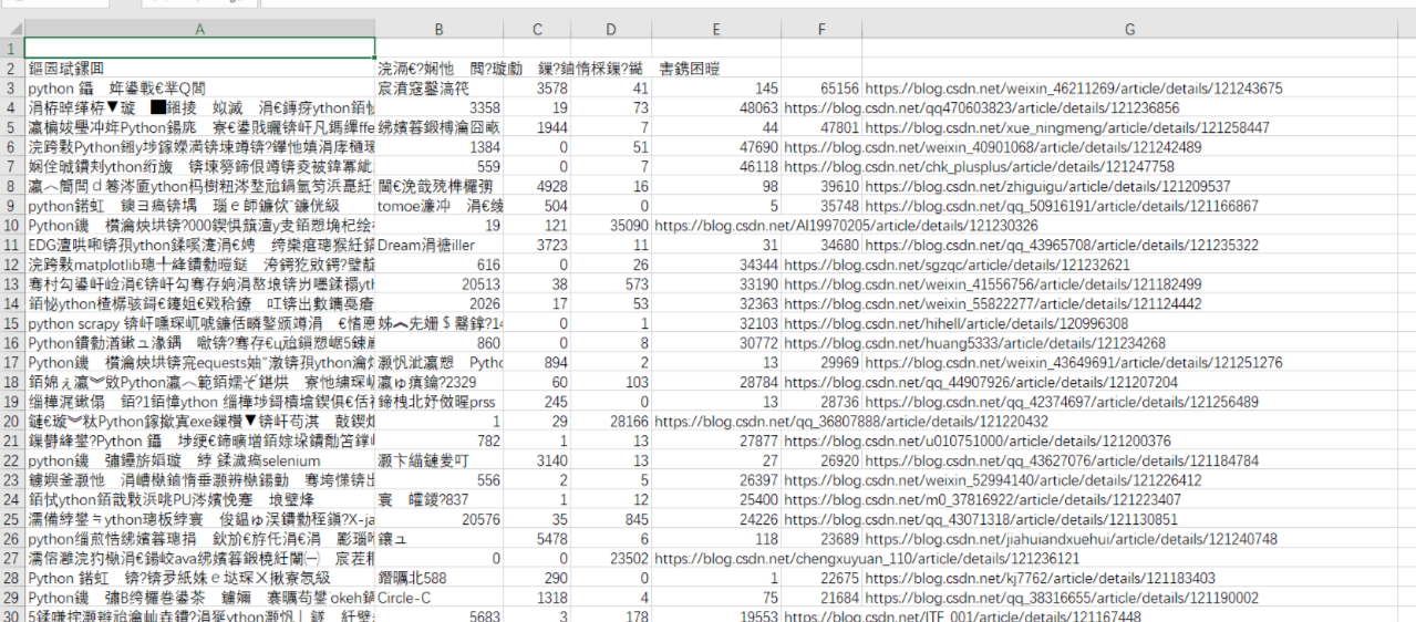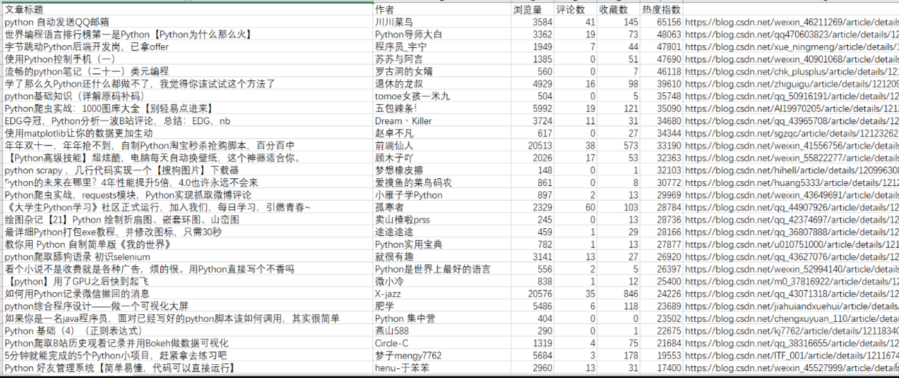 csdn_data.writerow(['文章标题', '作者', '浏览量', '评论数', '收藏数', '热度指数'])