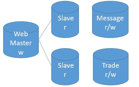 3、中规格(<5000QPS或1000TPS,读用户<5000,写用户<100): 垂直分库,将不同的业务分布到不同的数据库。