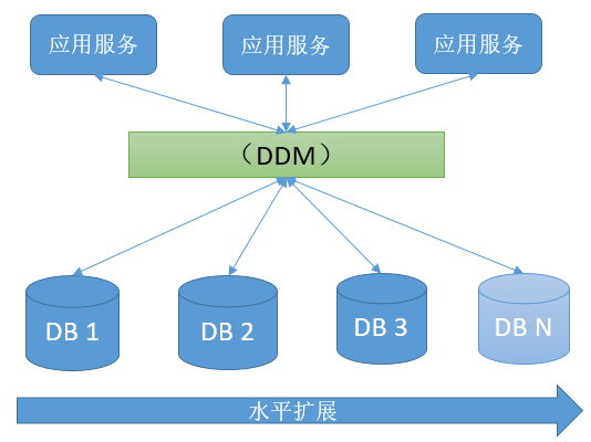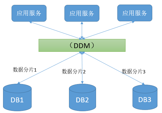 DDM业务架构:将底层的数据库引擎进行一个分布式的集中管理。应用服务访问DDM实例即可,无需关心底层分片式的数据库,所有的业务逻辑等都有DDM路由分发,从而让应用透明访问。