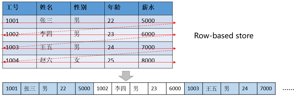 在基于行存储的数据库中,数据是按照行数据为基础逻辑存储单元进行存储的,一行中的数据在存储介质中以连续存储形式存在。