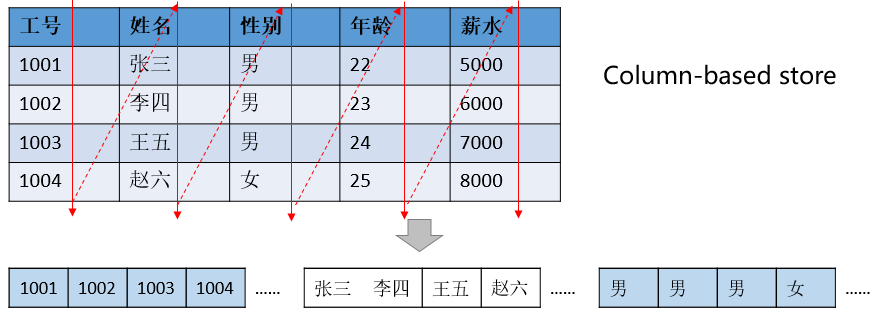 在基于列式存储的数据库中,数据是按照列数据为基础逻辑存储单元进行存储的,一列中的数据在存储介质中以连续存储形式存在。