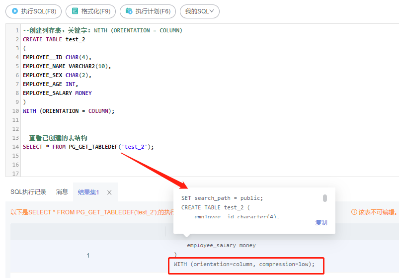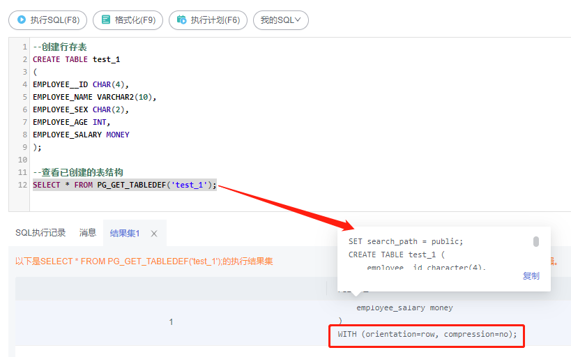 创建行存表,默认是创建的是行存表: