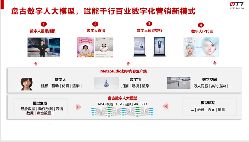 AIGC生产的数字人怎么让你分辨不出来?最底层是基于数字人大模型,这个大模型基于两类能力。第一类是基于模型生成能力,包括数字人的形象数据、动作数据、表情数据、声音数据等等,基于这些数据我们会提供一个模型生成的服务能力。第二类是基于模型驱动能力,人生成出来以后只是一个制作态,那怎么把这个人有效的驱动起来?这就依赖模型驱动的能力,包括语音、语义、情感等等方面的数据。这一系列的能力就组成了我们最底层的数字人大模型的能力。