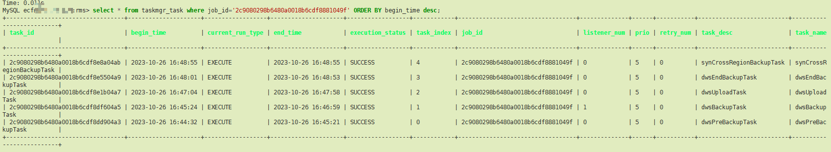 select * from taskmgr_task where job_id='2c9080298b6480a0018b6cdf8881049f' ORDER BY begin_time desc;