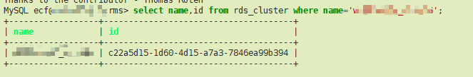 select name,id from rds_cluster where name='集群名称';