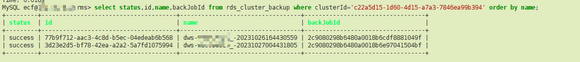 select status,id,name,backJobId from rds_cluster_backup where clusterId='c22a5d15-1d60-4d15-a7a3-7846ea99b394' order by name;