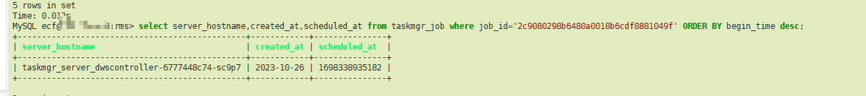 select server_hostname,created_at,scheduled_at from taskmgr_job where job_id='2c9080298b6480a0018b6cdf8881049f' ORDER BY begin_time desc;
