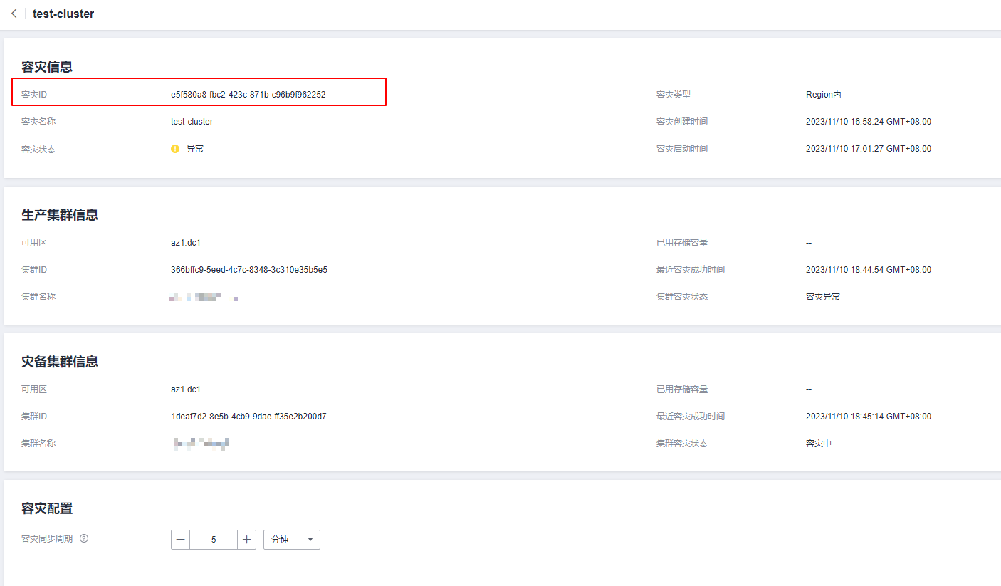 容灾管理-->点击容灾名称,进入详情后获取容灾ID