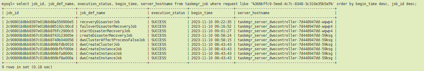 select job_id, job_def_name, execution_status, begin_time, server_hostname from taskmgr_job where request like '%f002086c-e653-4527-b0d5-09a184a7c5ed%' order by begin_time desc, job_id desc;
