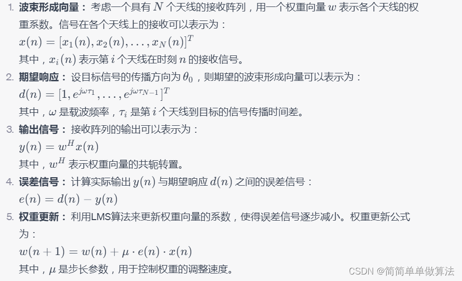自适应波束成形技术的核心思想是通过调整多个天线的权重系数,使得在特定方向上的信号增益最大化,同时减小其他方向上的信号增益。其中,最小均方(LMS)算法是一种常用的自适应算法,用于计算权重系数。以下是LMS自适应波束成形的基本原理: