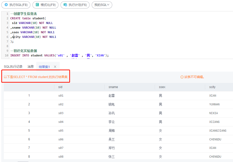 INSERT INTO student VALUES('s08' , '张三' , '女', 'CHENGDU');