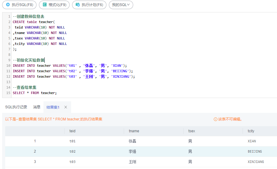 INSERT INTO teacher VALUES('t02' , '李强', '男', 'BEIJING');