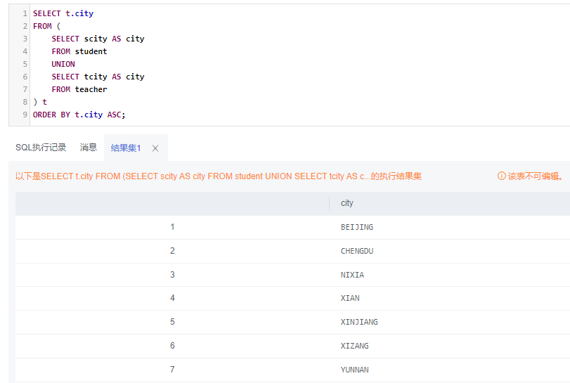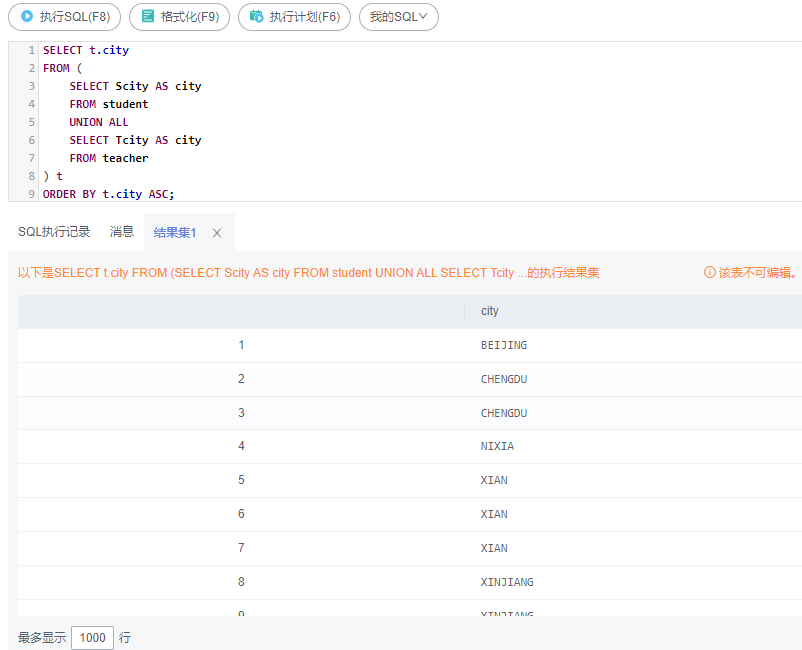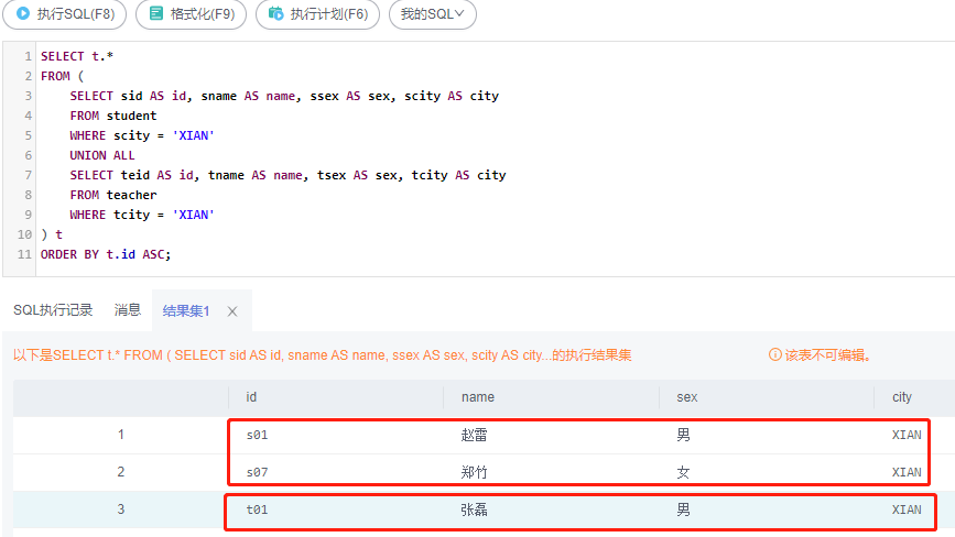 结果集如下截图,罗列了'XIAN'的学生和教师的所有信息: