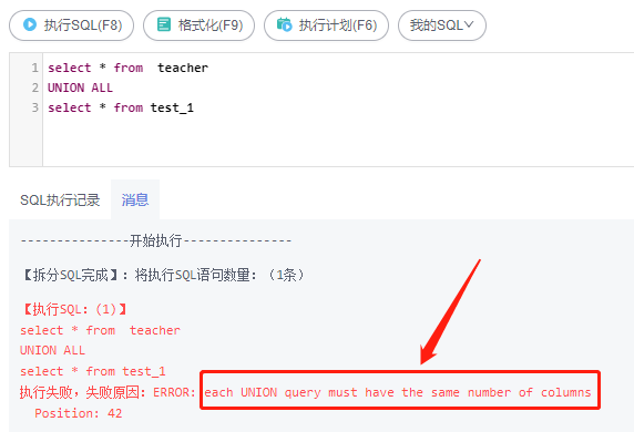 • 左右两侧的SQL字段数量和字段类型需要保持一致;