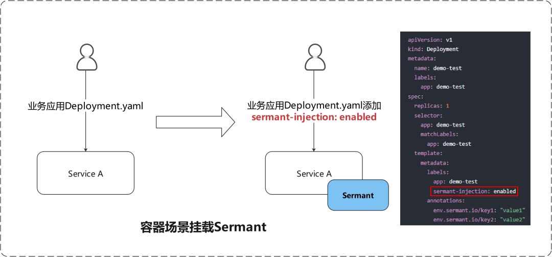 在容器场景,在部署了sermant-injector组件后,创建容器时只需在Deployment中添加一行sermant-injection:enabled的Label就能在创建Pod时让业务应用挂载Sermant启动,真正做到一键接入。