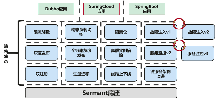 Sermant框架底座封装了字节码增强的SPI接口,提供了动态配置、事件上报等能力,基于这个底座的插件开发基础,Sermant提供了完善和便利的开发生态,把所有的服务治理功能插件化。目前开源仓库中的插件已经有了限流降级、灰度发布、优雅上下线等能力